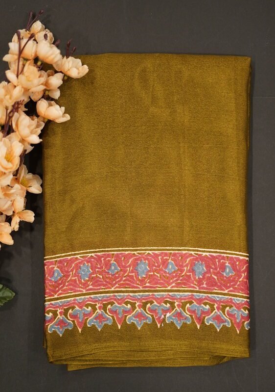 “Fabric – Satin chiffon crush silk with beautiful embroidery & moti work scalloped cut work border Blouse – contrast work blouse Saree cut – 5.5 meter Blouse cut – 0.8 meter” has been added to your cart.