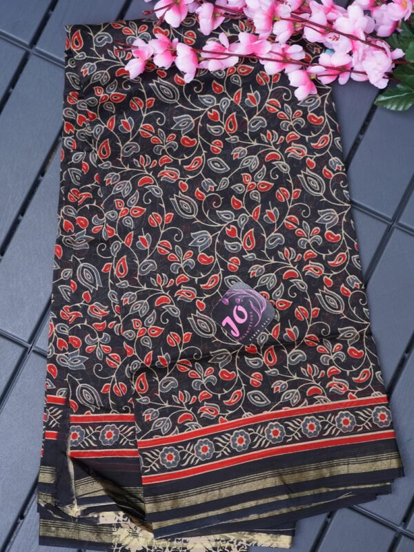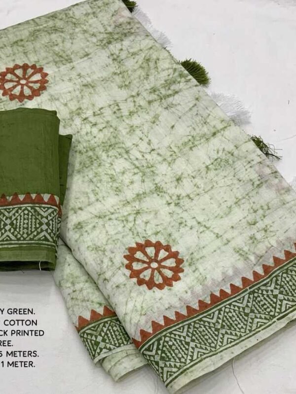 Hand block printed spray style cotton saree. Brush chanderi Quality- soft chanderi cotton saree with hand-block prints. Tassles on pallu. Blouse- contract block printed chanderi cotton blouse. Saree- 5.5 meters. Blouse - 1 meter