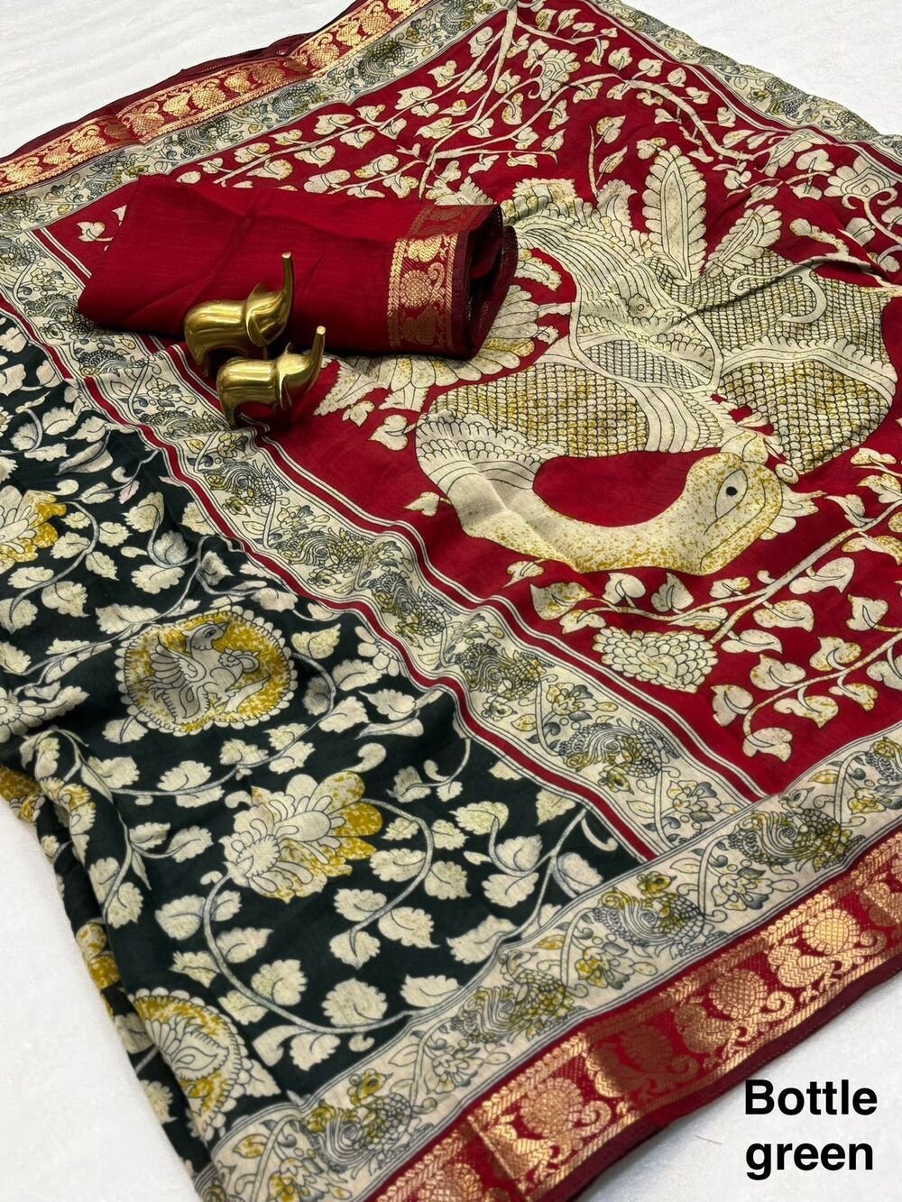 Beautiful Mangalagiri cotton sarees with all over Penkalamkari design along with zari weaving peacock border and Kalamkari designed pallu with Blouse as in pic