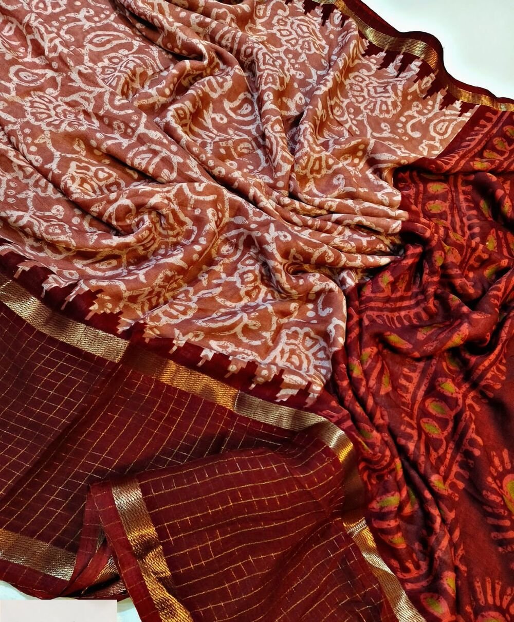 Beautiful soft Georgette sarees with all over print design along with contrast zari woven checks border with Contrast pallu and running blouse