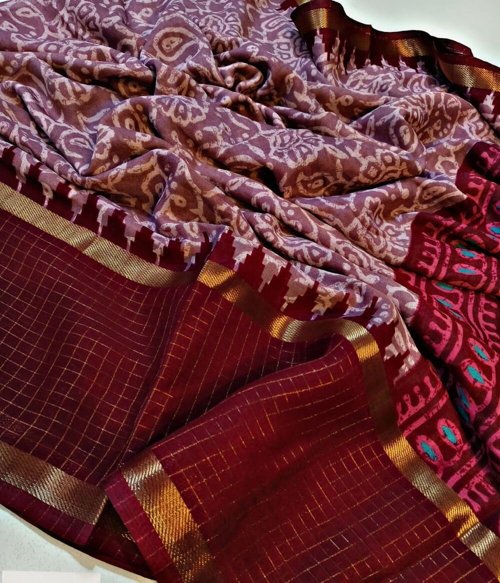 Be the first to review “Beautiful soft Georgette sarees with all over print design along with contrast zari woven checks border with Contrast pallu and running blouse” Cancel reply