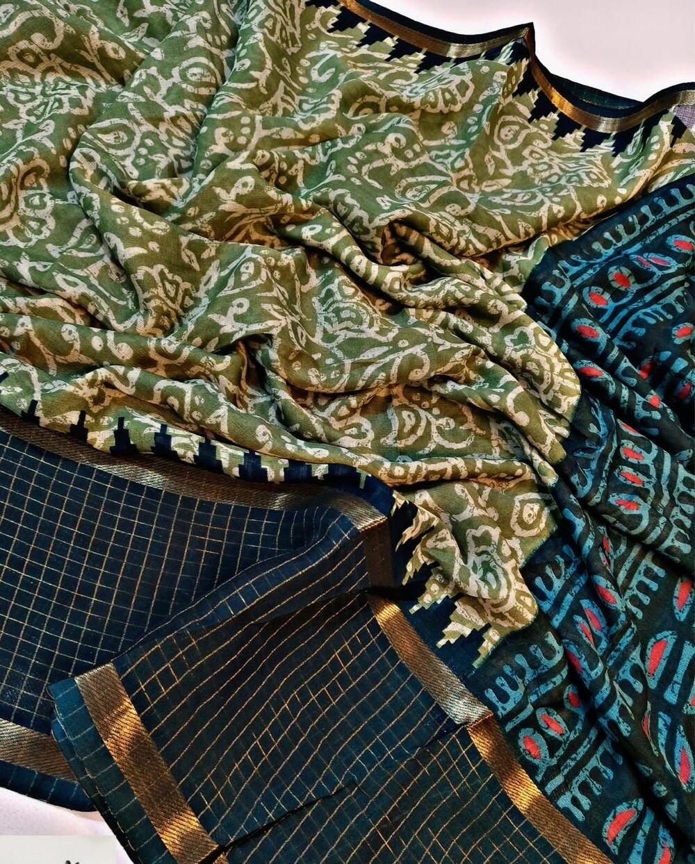 Be the first to review “Beautiful soft Georgette sarees with all over print design along with contrast zari woven checks border with Contrast pallu and running blouse”