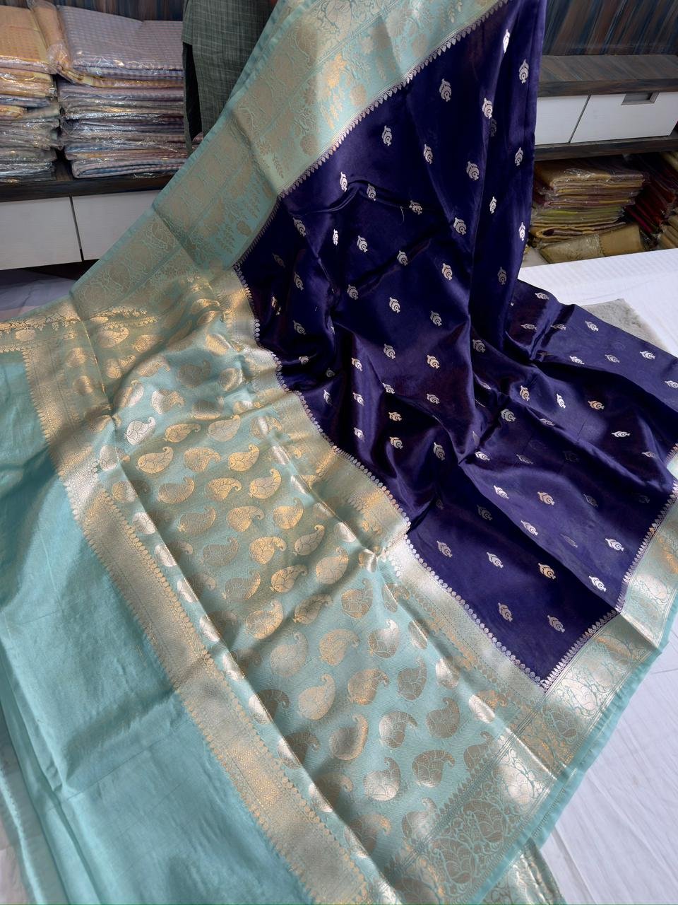 Benarasi paper soft silk fabric saree contrast Benarasi border.. Benarasi zari butti weaving on full saree.. Contrast blouse Fancy contrast weaving designer pallu *Note fabric paper silk soft*