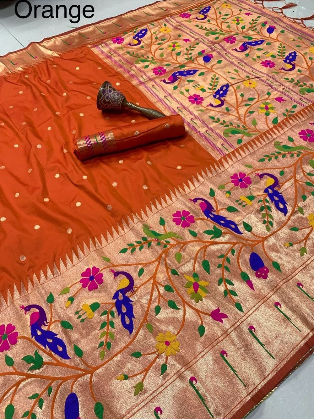 FABRIC- SOFT KANCHIVRAM Paithani SILK WITH ORIGINAL PURE ZARI BROCKET DESIGN AND MINAKARI BORDER AND HEAVY MINAKARI PAITHANI WEAVING pallu Blouse – Running with zari border
