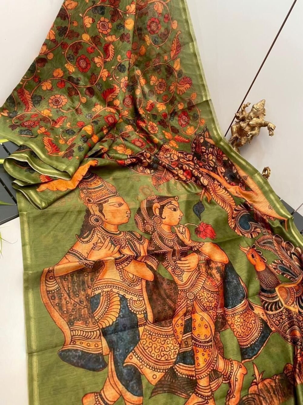 Be the first to review “Linen Digital Print Saree With Kalamkari With In Full Saree With Zari Wooven Border With Running Blouse”