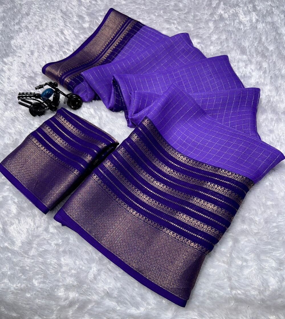 Mysore crepe silks Soft mysore crepe with zari chex pattern and contrast zari lining concept border with contrast crepe blouse Soft n flowy material, very comfortable to wear