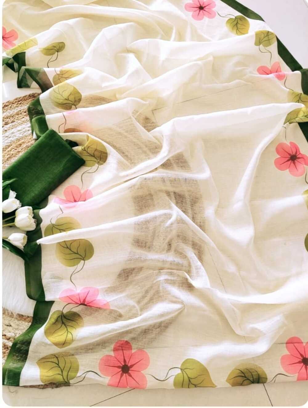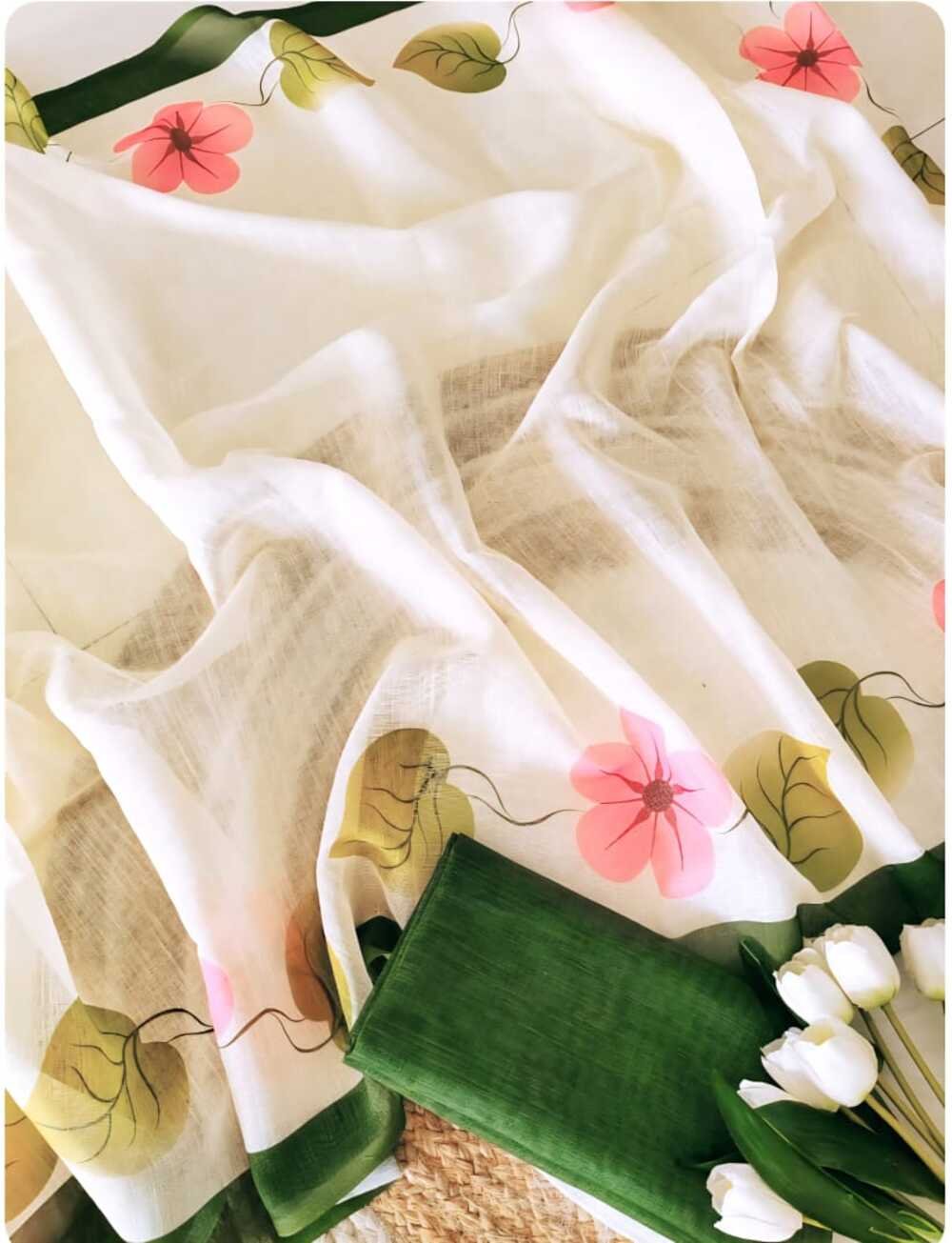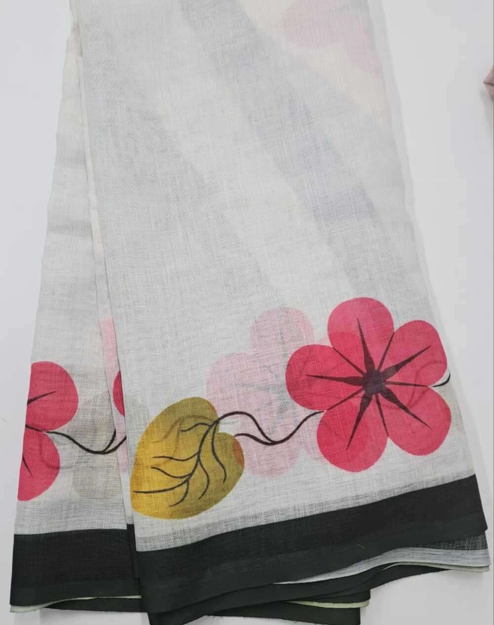 New fancy single edition. floral linen.Soft linen c-pallu floral printed saree. Running Contrast printed blouse. Saree- 5.5 meters. Blouse- 1 meter.