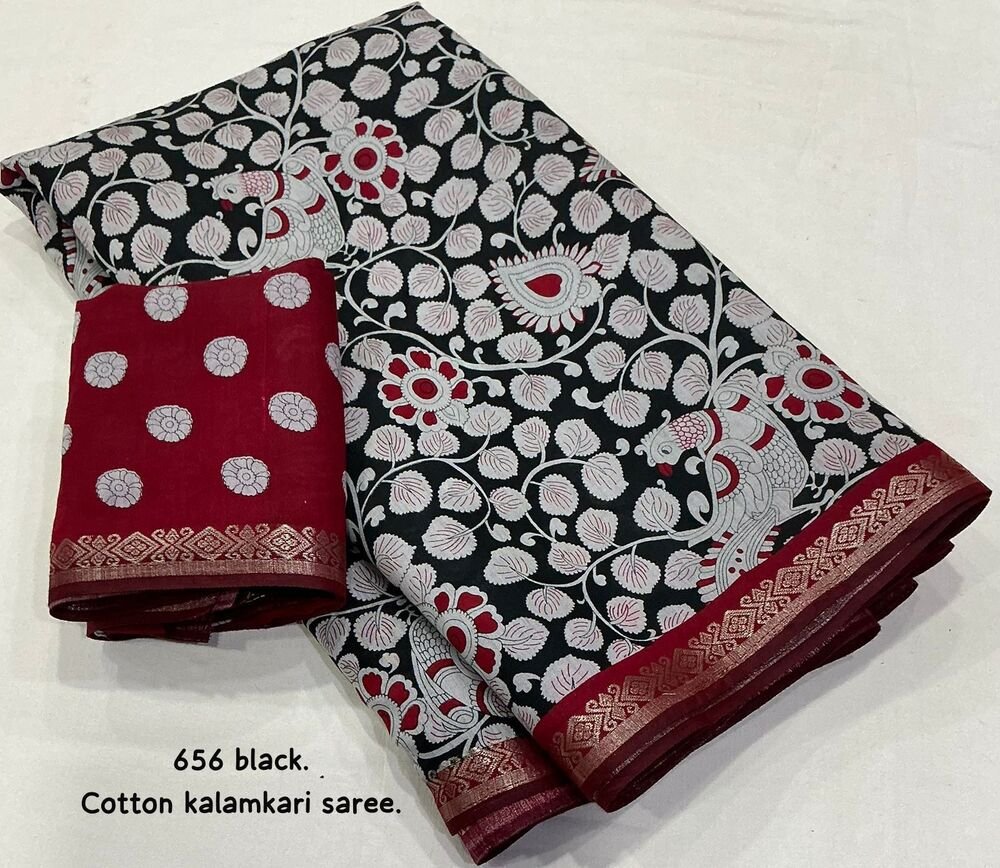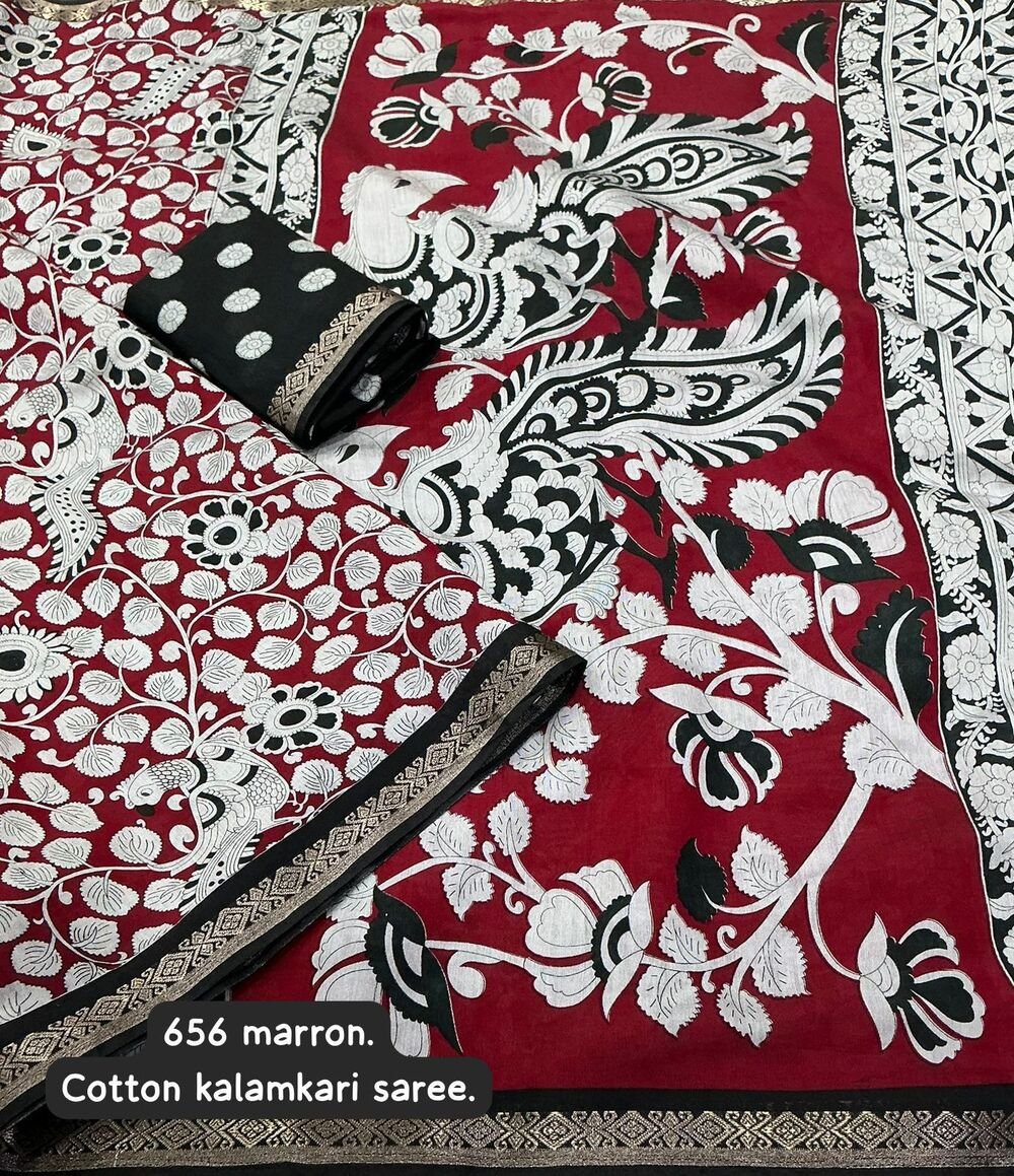 New trending mangalgiri style cotton printed saree. cotton kalamkari. Soft cotton style kalamkari printed saree with zari pattu woven border. Running butti printed blouse. Full lengrh 6.30 meters.