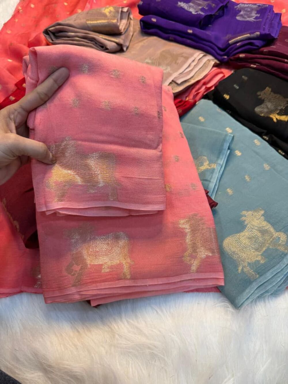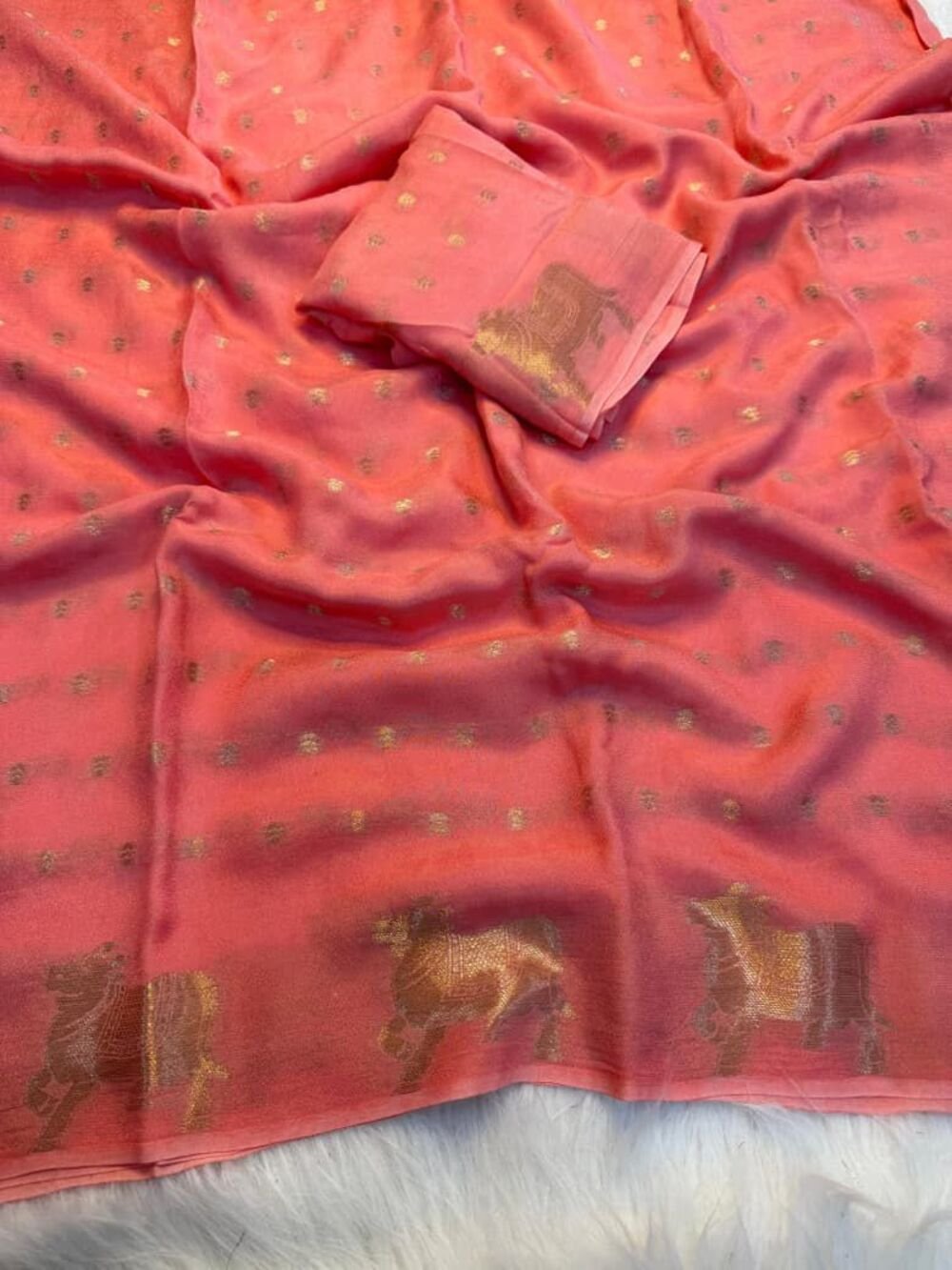 Pure viscose russian crepe saree with pichwai jacquard zari weave design in panel and butti weaving in body Paired with running blouse