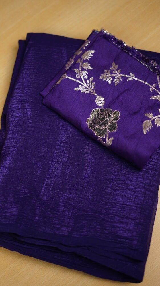 Be the first to review “Soft crush chiffon saree with simple saree Perfectly matched tye and dye Banarasi zari woven blouse. Full length 6.30 meters.”