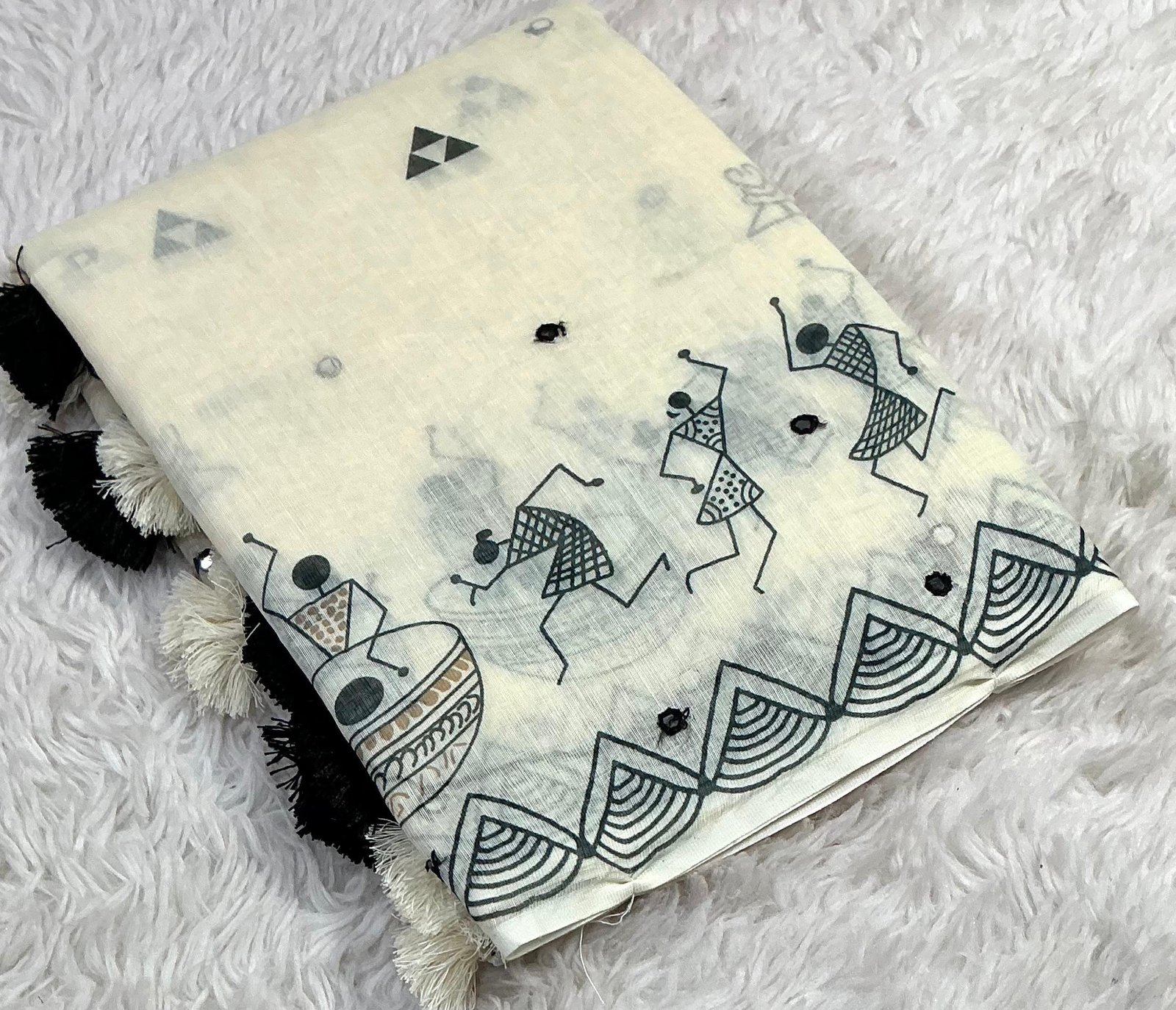 Quality – Soft Linen Saree With Aari Mirror Work Beige color.