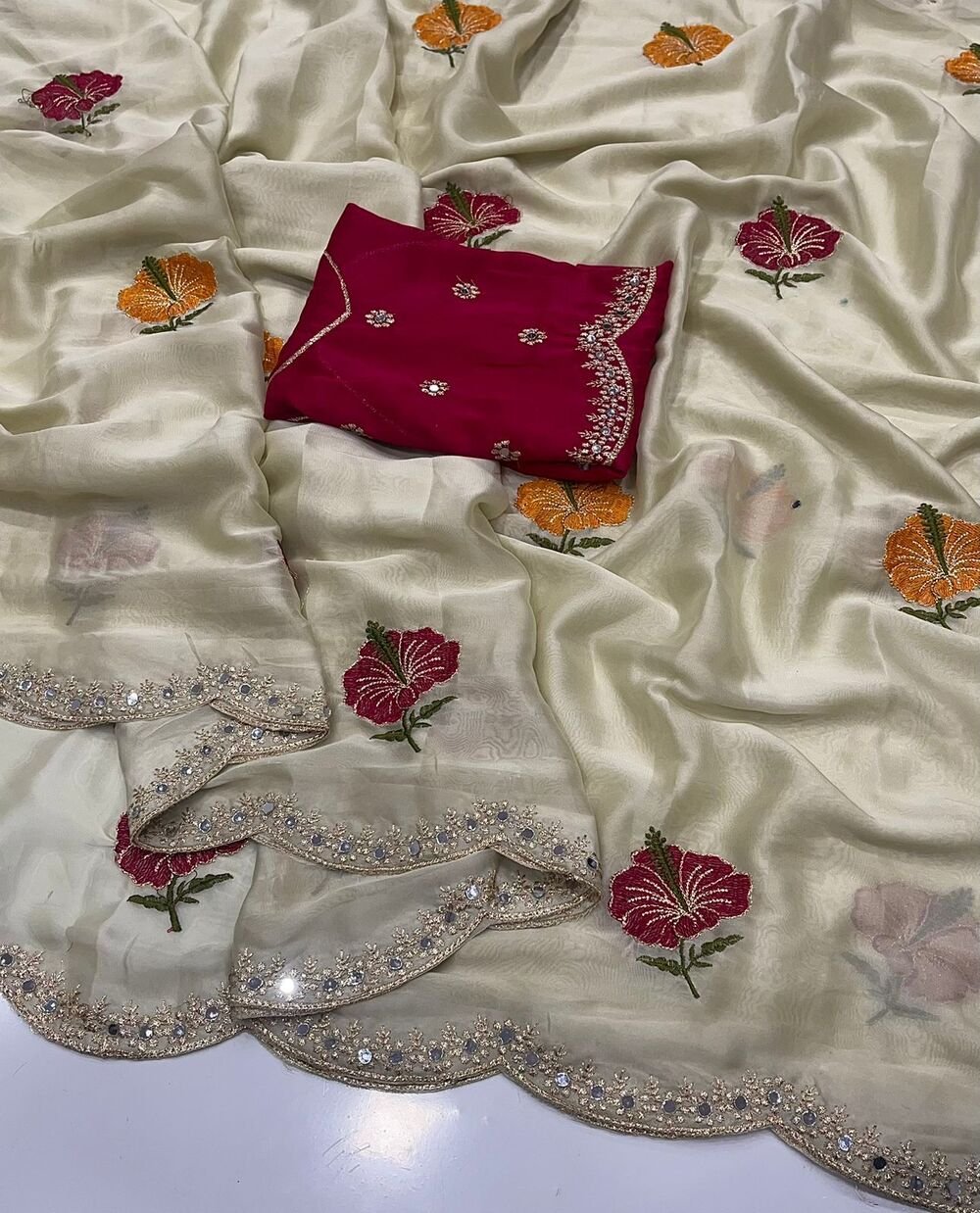 Be the first to review “Soft Rangoli silk with embroidery work and mirror work all over in border With embroidery work contrast blouse”