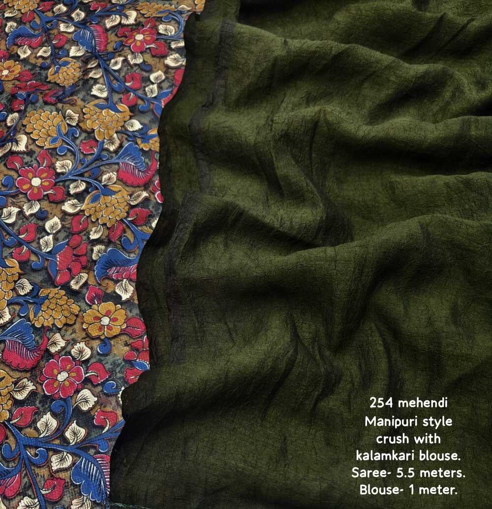 solid dark plain crush saree with fancy kalamkari blouse. Quality- soft manipuri feels saree with self shining and additional crush on it. Cotton tassles on pallu. Blouse- self woven tilak crape silk kalamkari printed blouse. Saree- 5.5 meters. Blouse- 1 meter.