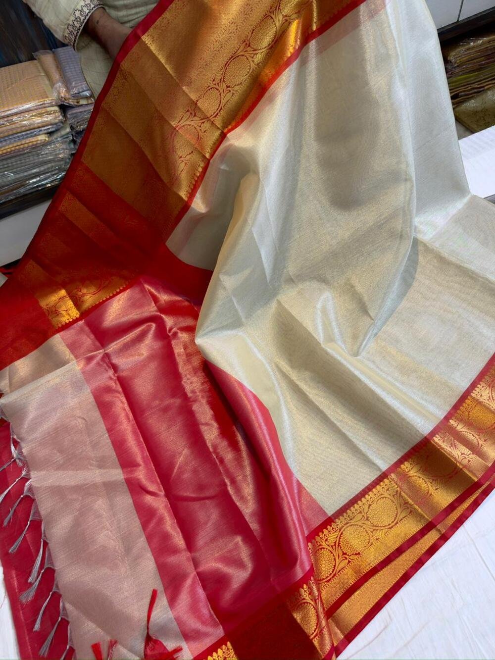 Tissue love ❤ Latest benarasi soft tissue saree Fancy Benarasi contrast kanchipuram style border design Full body soft and shining tissue weaving 😍😍 Full body best quality tissue fabric weaving Soft n shinning pure look Jaquard.. contrast pallu and blouse..