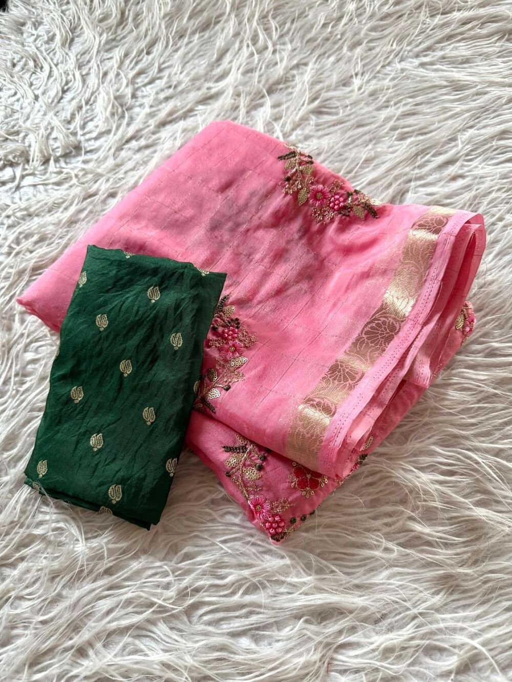 Be the first to review “Viscose chinnon chex saree with multi colour thread embroidery butta work Teamed with viscose butti silk blouse”
